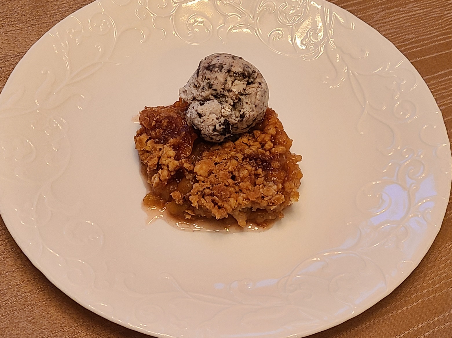 Every summer, we get tons of apples in our backyard. We have two apple trees that produce hundreds of apples. We make many things from the apples but my favorite is Apple Crisp. I especially enjoy the texture of the oatmeal mixed with the carmalized cinnamon flavored apples. This recipe works best with slightly tart apples. Our home grown apples are normally on the sour end. However, if your apples are sweeter, a bit of lime juice can be added with sweeter store bought apples.